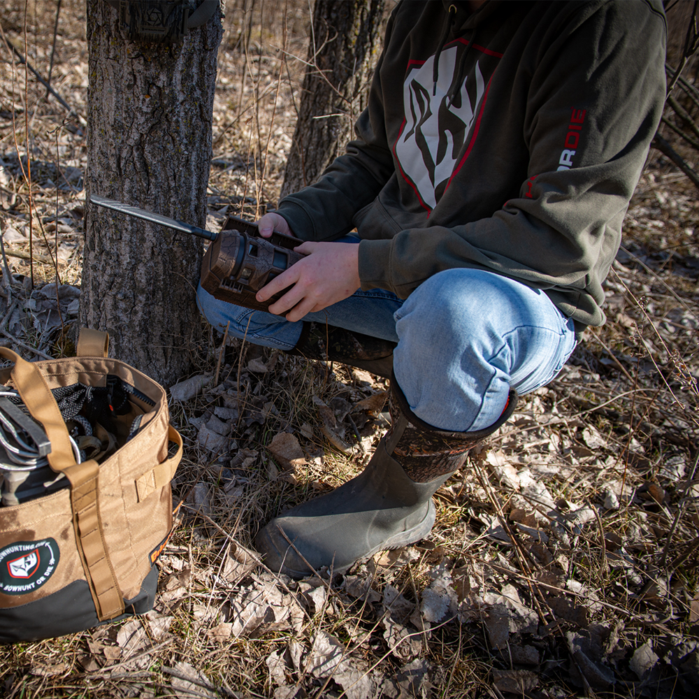 Moss green Carhartt mid-weight hoodie with red/white Antler Shield logo on the front and BOWHUNTORDIE text on the sleeve.