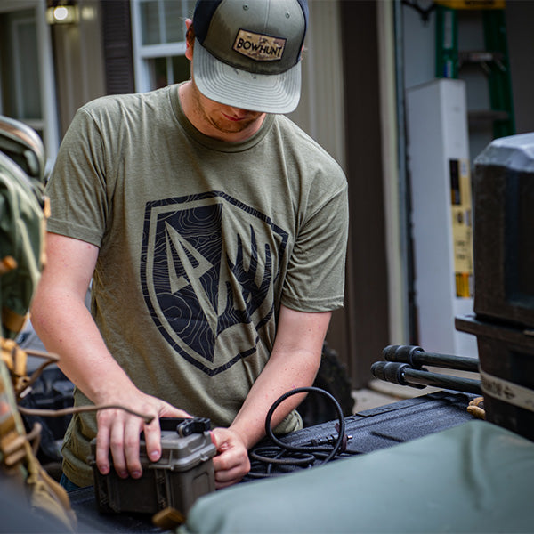 Embrace the outdoors with our Topo-Graphic Tee, a perfect blend of comfort and rugged style. This moss green shirt is crafted from a soft, durable 60/40 cotton-polyester blend, making it ideal for everything from a trail hike to a casual day out. The front features our signature Antler Shield logo, with intricate topography lines embedded within the shield.