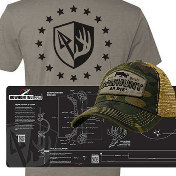 Help us celebrate our 16th Season of Bowhunt or DIe, 16 stars for 16 years! The Season 16 Bundle includes our Season 16 T-Shirt, Camo Sneak Patch Hat & a large Bench Mat - a $90 Value